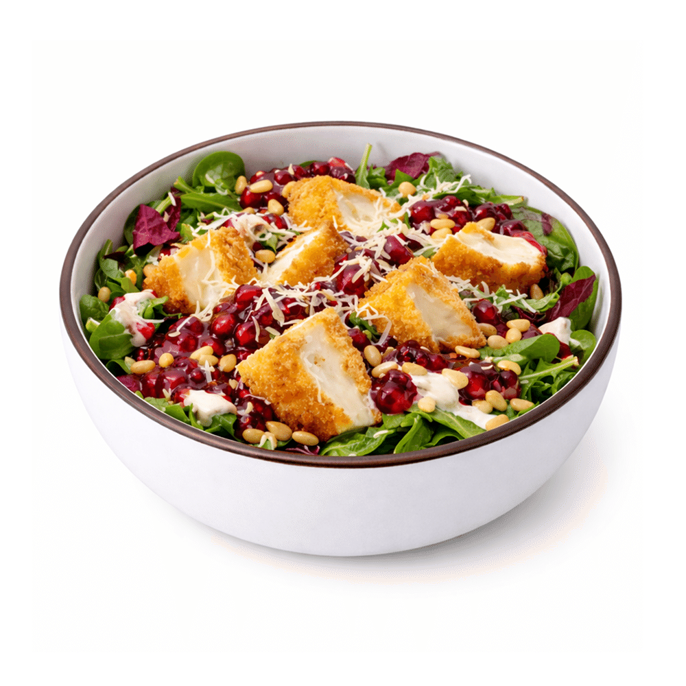Микс салата (состав салатного листа может меняться), сыр камамдер в кляре, соус брусничный, сыр пармезан.