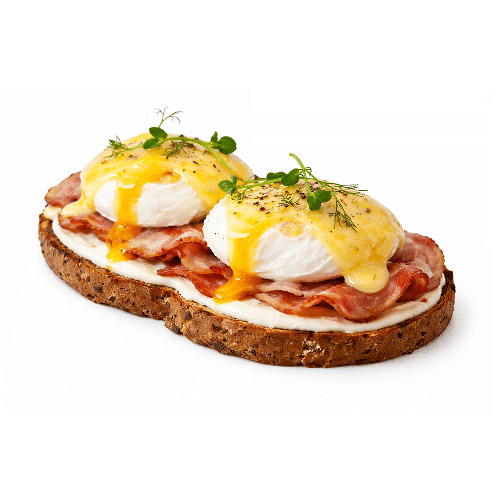 Тост из зернового хлеба, яйцо пашот, бекон, соус голландез, сливочный мусс.